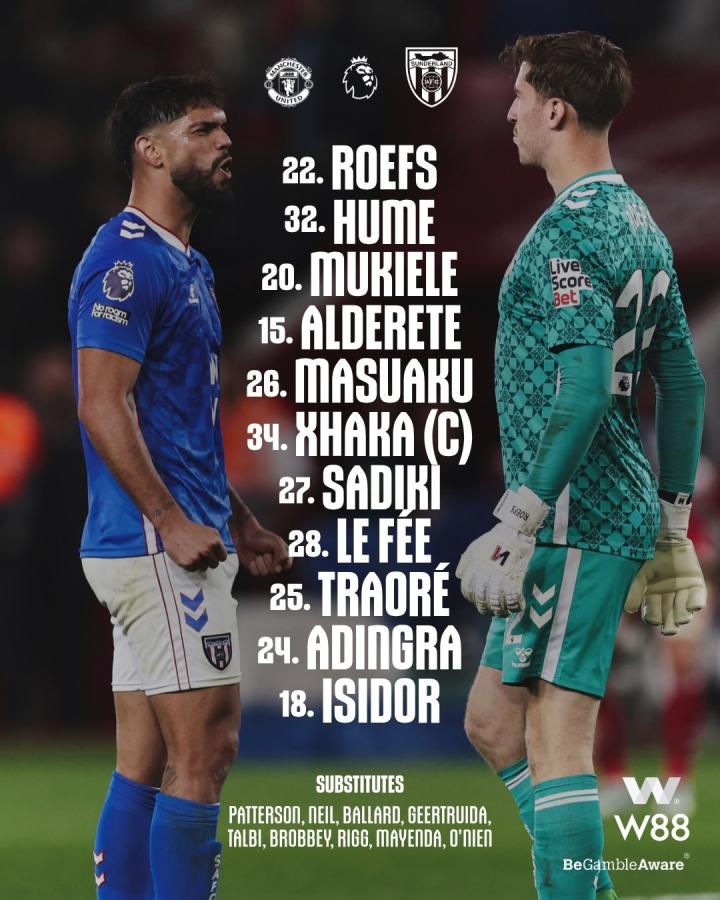 桑德兰首发阵容:22号罗埃夫斯、32号休姆、20号穆杰莱、15号阿尔德雷特、26号马苏亚库、34号扎卡、27号萨迪基、28号勒费埃、25号伯特兰-特拉奥雷、24号阿丁格拉、18号伊西多尔